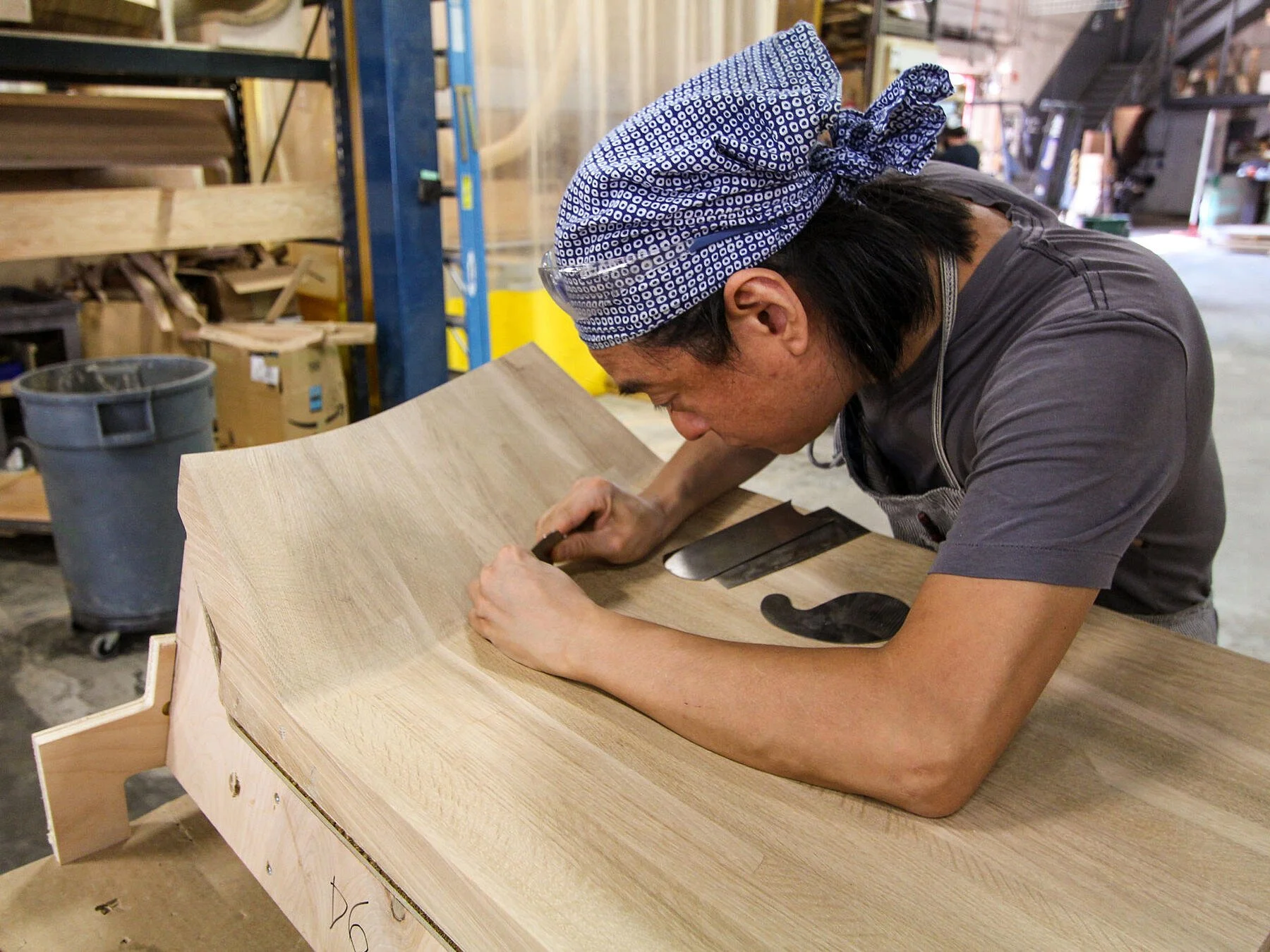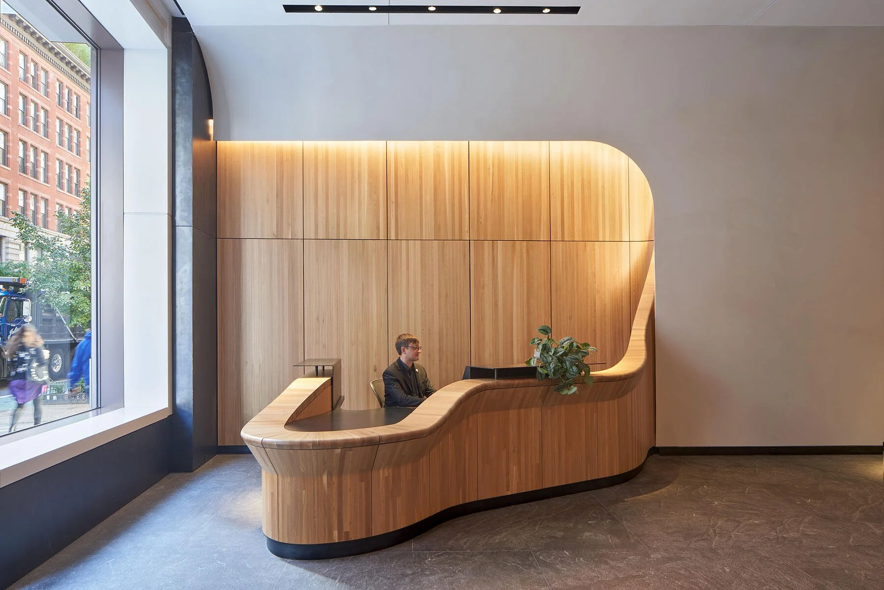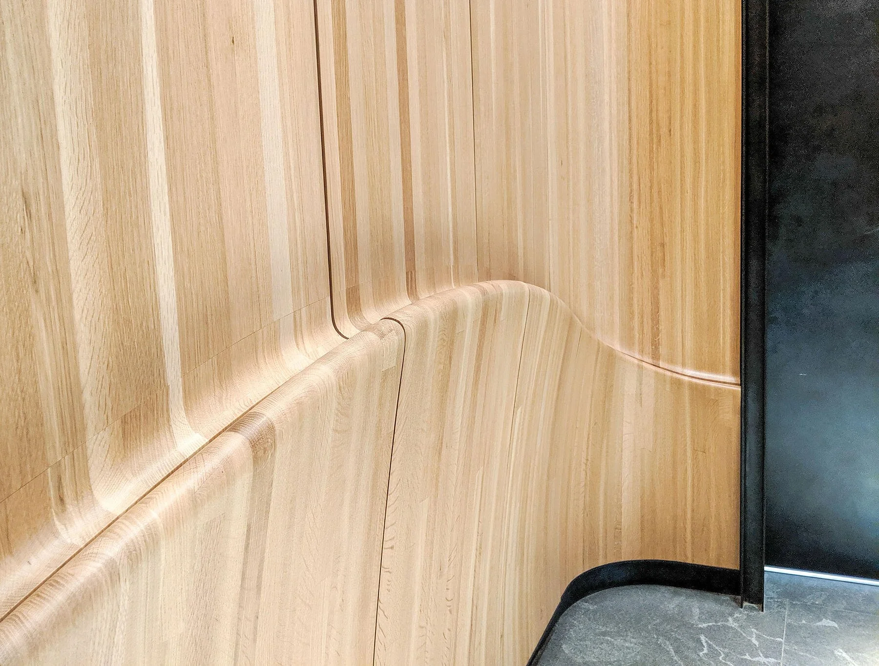 The architects envisioned a curvilinear reception wall with double curvature. Initially, they considered veneer, but the geometry wasn’t feasible with that material. Together, we developed a solution using stacked laminated solid wood.