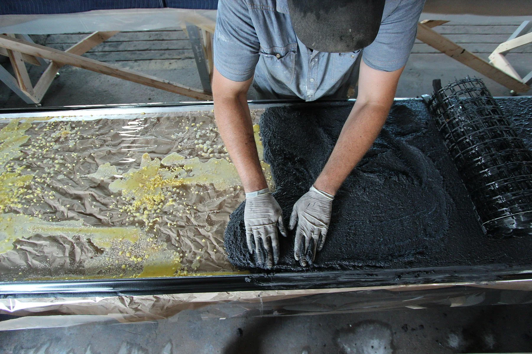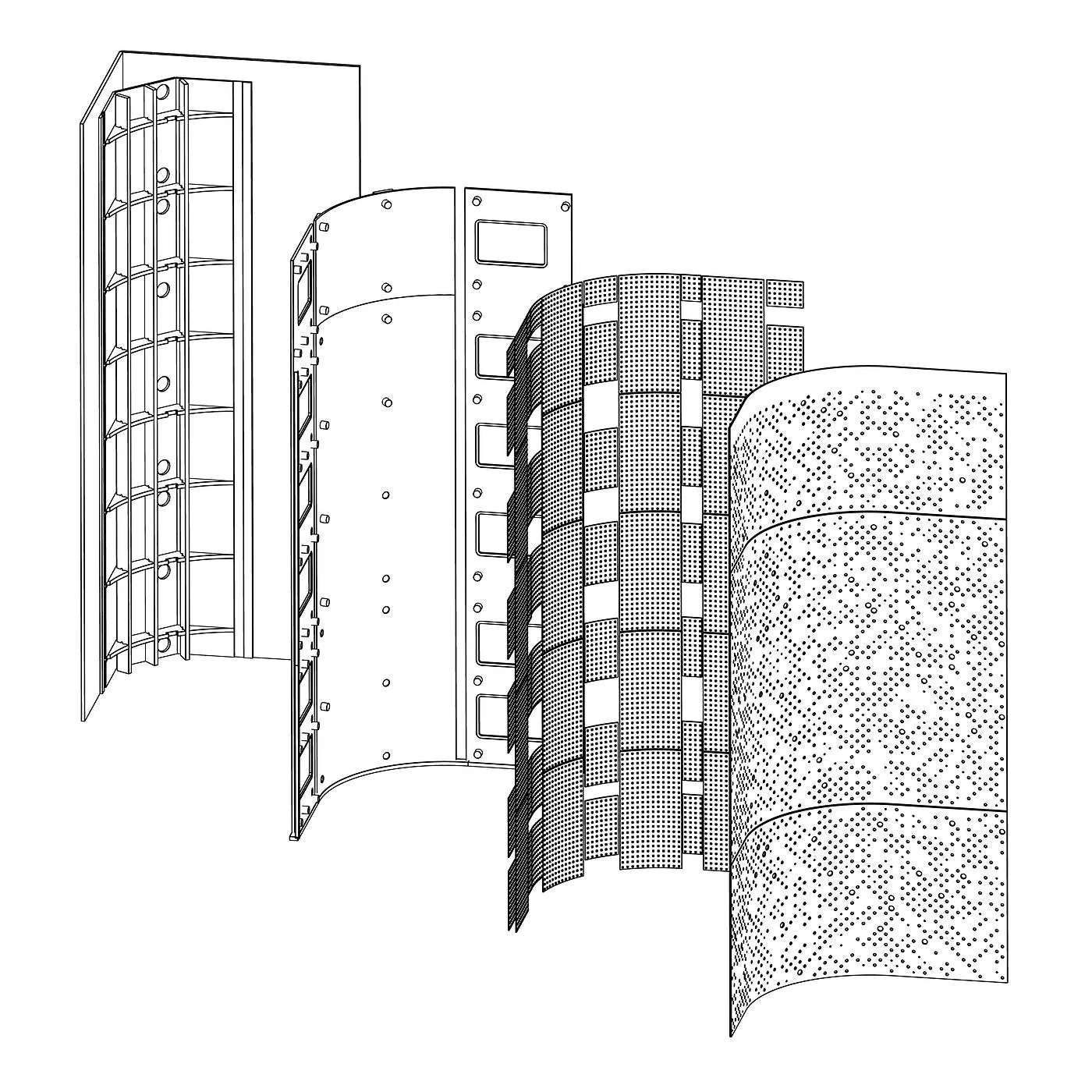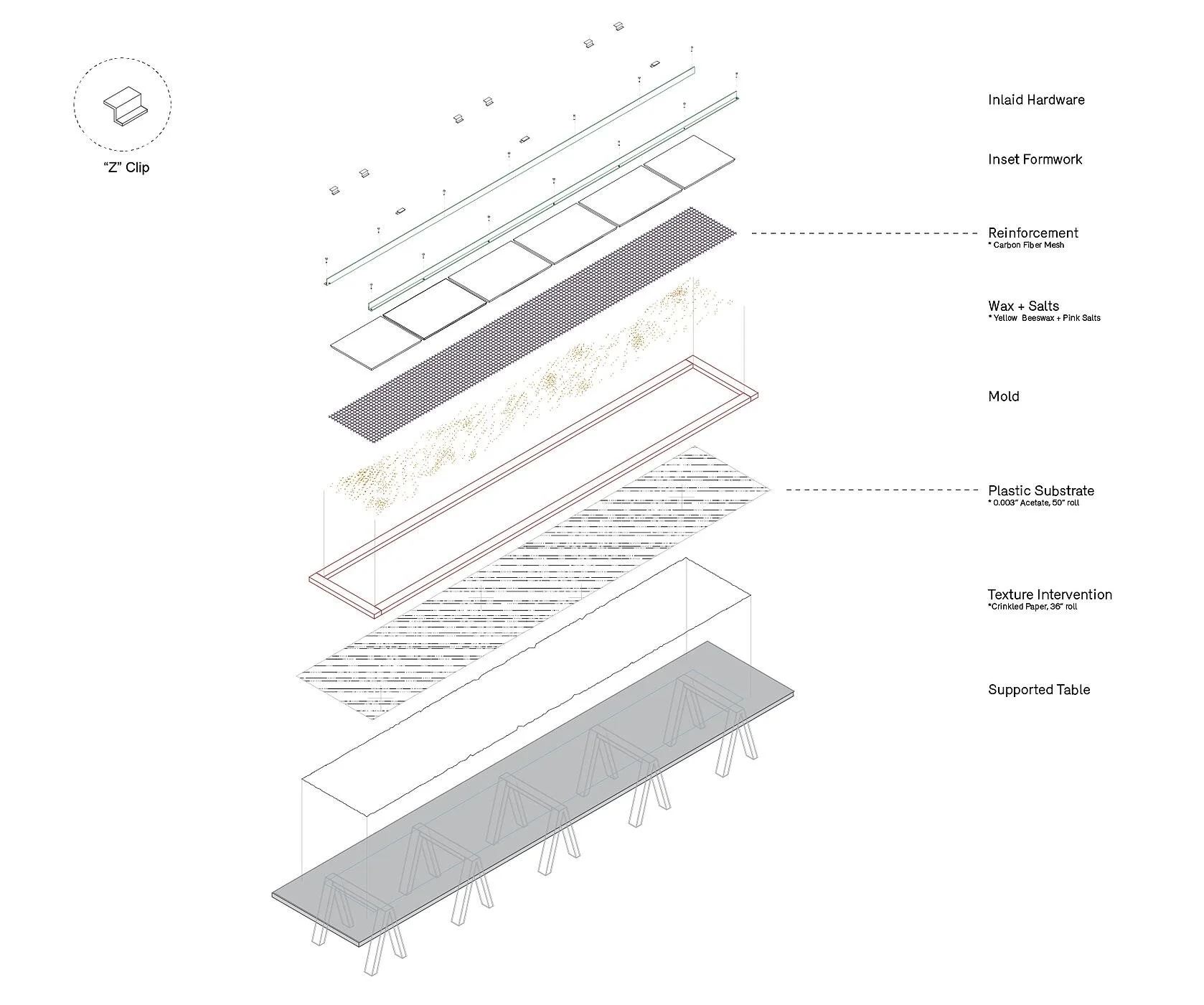 Fiber-reinforced concrete was cast against layers of crinkled paper and acetate, with beeswax and salt applied directly to the surface. After curing, the 17-foot-tall panels were moved to a custom oven table, where the wax was melted out and most of the salt removed. Some crystallized salt remained embedded in the surface as bright accents against the dark concrete.