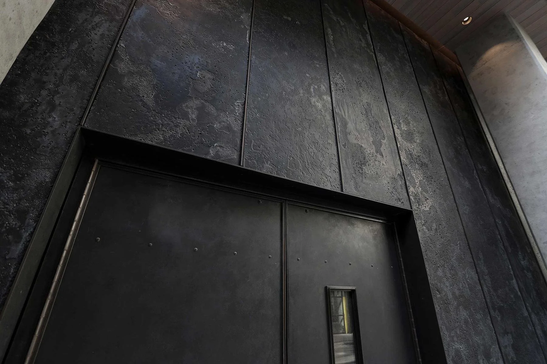 We produced a total of 64 panels, cladding both the interior and exterior portions of the building. Exterior panels were left untreated, allowing their surfaces to evolve naturally over time.
