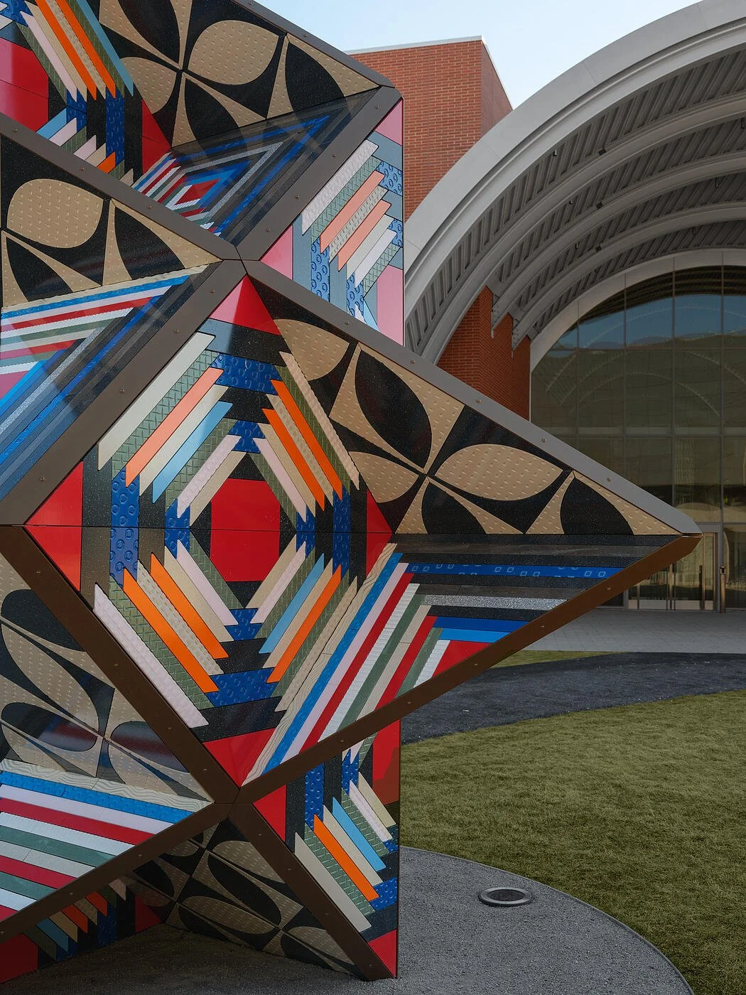 Madrigal is an 18-foot-tall outdoor sculpture by artist Sanford Biggers, commissioned for MIT’s new Edward and Joyce Linde Music Building. The work transforms six distinct quilt patterns into a monumental three-dimensional form, producing a dazzling interplay of geometry, pattern, and color.